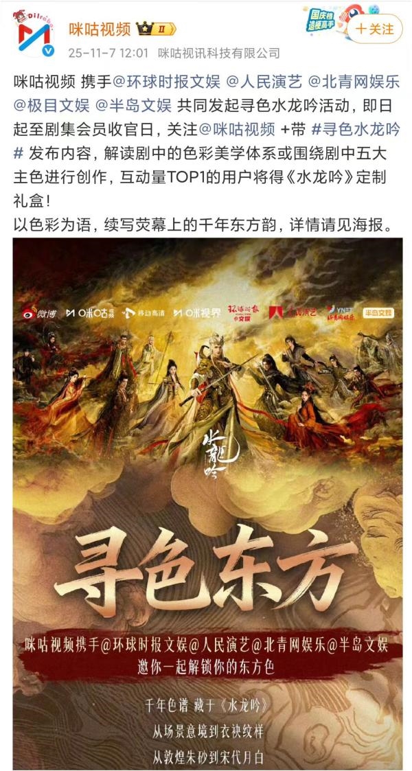 在剧集热播期间,咪咕视频联合环球时报文娱、人民演艺、北青网娱乐、极目文娱、半岛文娱等多家权威媒体,共同发起#寻色水龙吟#美学企划活动,以色为媒,引导公众探寻东方色谱的当代诠释。这场活动在社交平台引发热烈讨论,形成了多层次的美学对话。