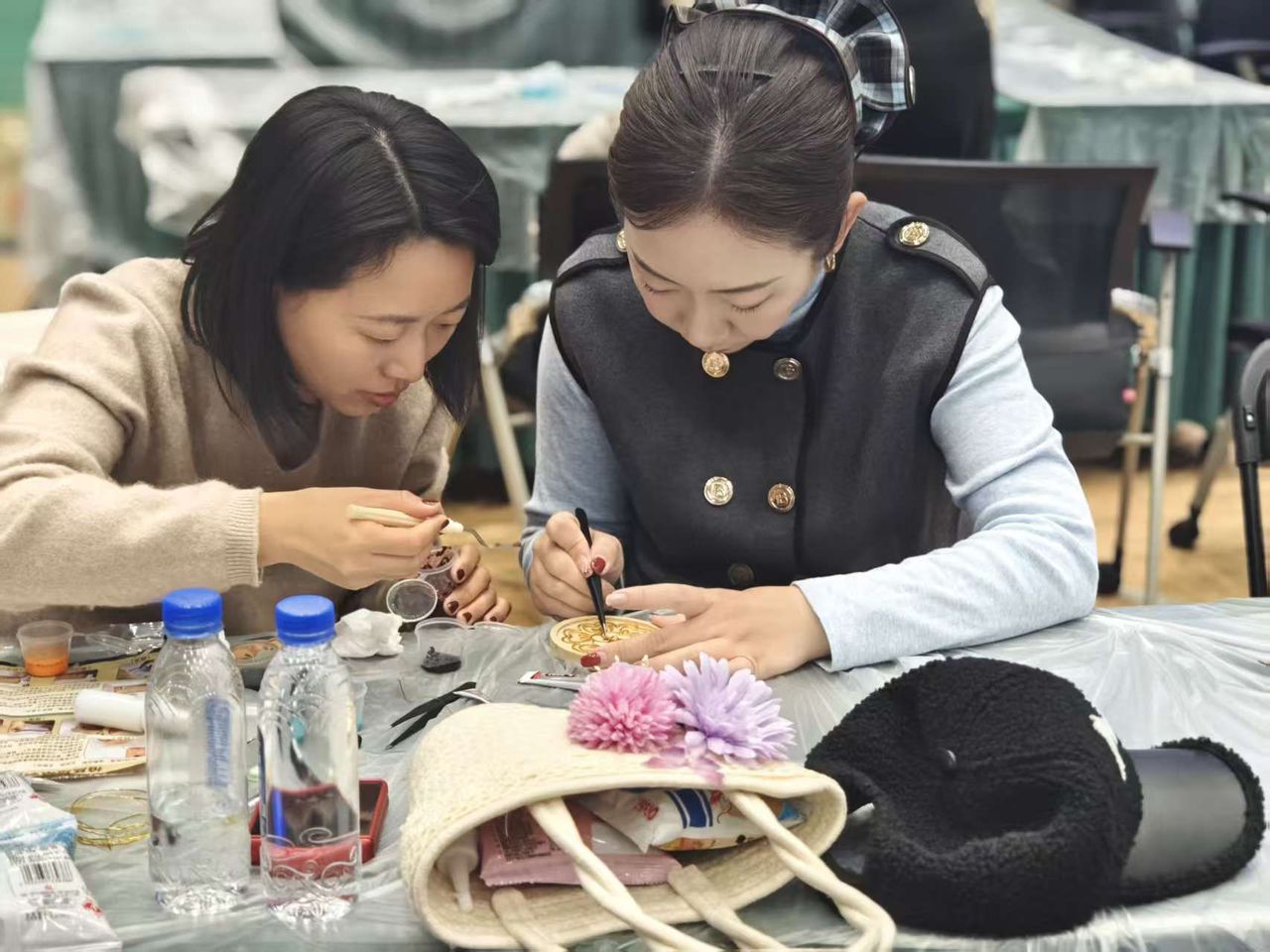 活动在产业园区职工之家二楼体育馆举行,设置非遗掐丝珐琅、小马皮具、口红制作、香薰蜡烛、花艺编织包、螺钿胸针、点翠、永生花夜灯8个体验项目,200名女职工报名参与,在专业老师指导下开启传统与创意交融的手工之旅。现场,老师们细致讲解项目历史渊源与制作工艺,从掐丝珐琅的金丝勾勒、点蓝填色,到点翠工艺的羽毛镶嵌、精致塑形,女职工们化身巧手匠人,全神贯注地投入创作,选料、裁剪、拼接、打磨,每一个步骤都饱含巧思,在指尖造物中感受慢工细作的匠心,收获亲手完成作品的成就感。